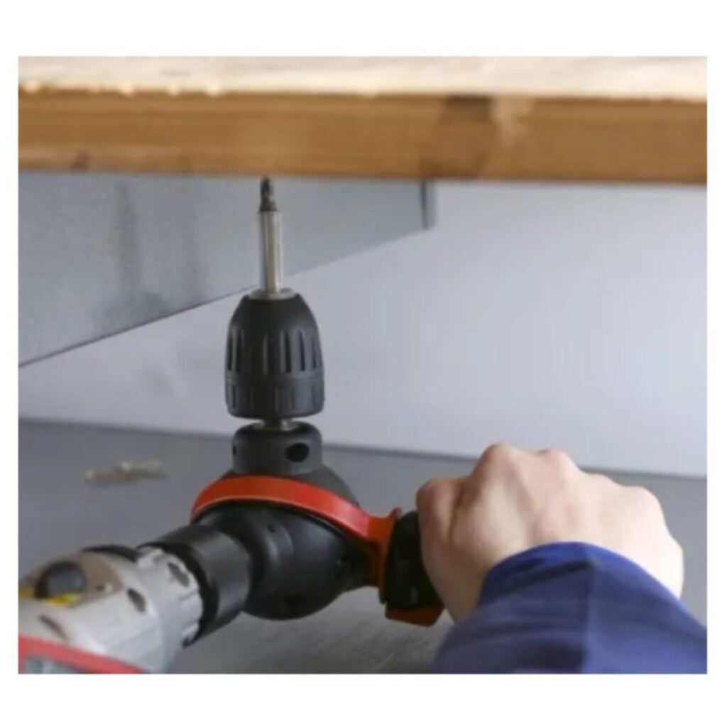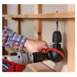 Cabezal de portabrocas angular de 360° con portabrocas de sujeción rápida. Mediante giro de la articulación esférica, el portabrocas puede ajustarse a cualquier posición en círculos de 360°. Esto permite que el cabezal angular pueda ser empleado tanto por zurdos como por diestros. Mediante giro del mango, el cabezal de taladrar es bloqueado. El mango engomado y antideslizante permite una dirección segura al taladrar, con el fin de transmitir la fuerza de taladrar necesaria a cualquier lugar difícilmente accesible. Por motivos de seguridad, la longitud máxima de la broca puede ser de 190 mm / 3/4″. Con el engranaje cónico interior pueden realizarse también trabajos de larga duración, por lo que el cabezal angular es támbien útil para perforaciones en serie en obras interiores y en obras de construcción. Con el vástago de 6 cantos, el cabezal de portabrocas angular puede montarse en cualquier atornillador con batería o taladradora corrientes de venta en el mercado. No es válido para su uso con sierras de corona o en brocas largas como brocas de encofrado, perforadoras de muros o salomónicas.