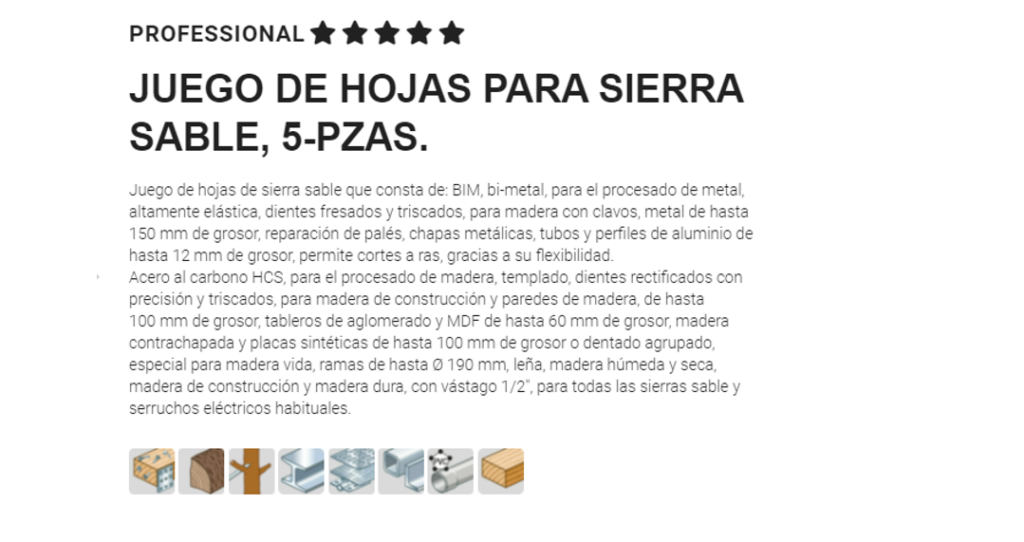 Acero al carbono HCS, para el procesado de madera, templado, dientes rectificados con precisión y triscados, para madera de construcción y paredes de madera, de hasta 100 mm de grosor, tableros de aglomerado y MDF de hasta 60 mm de grosor, madera contrachapada y placas sintéticas de hasta 100 mm de grosor o dentado agrupado, especial para madera vida, ramas de hasta Ø 190 mm, leña, madera húmeda y seca, madera de construcción y madera dura, con vástago 1/2″, para todas las sierras sable y serruchos eléctricos habituales.