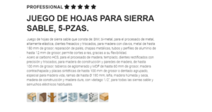 Juego de hojas de sierra sable que consta de: BIM, bi-metal, para el procesado de metal, altamente elástica, dientes fresados y triscados, para madera con clavos, metal de hasta 150 mm de grosor, reparación de palés, chapas metálicas, tubos y perfiles de aluminio de hasta 12 mm de grosor, permite cortes a ras, gracias a su flexibilidad.