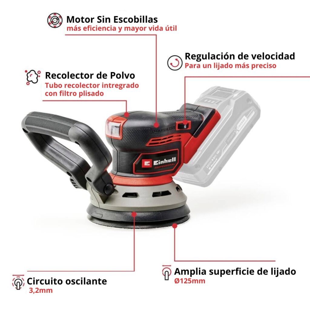 La lijadora excéntrica a batería Einhell Professional TP-RS 18/32 Li BL-Solo es una lijadora fiable para uso intensivo en el taller. El principio excéntrico garantiza el pulido más fino con un alto rendimiento de pulido y altos índices de eliminación. La potencia se puede adaptar al material respectivo y a la tarea correspondiente mediante una electrónica de velocidad. Como miembro de la familia Power X-Change, la amoladora inalámbrica se puede combinar con todas las baterías y cargadores de la familia de sistemas. El dispositivo funciona con el motor sin escobillas Einhell PurePOWER. Este motor sin escobillas ofrece más potencia y mayor tiempo de funcionamiento que los motores con escobillas de carbón tradicionales. Después del registro online, se aplica una garantía de 10 años al motor sin escobillas. El diseño plano de la lijadora excéntrica garantiza un manejo óptimo, gracias al cual se puede guiar el dispositivo cerca de la pieza de trabajo. Para un guiado óptimo del dispositivo, el molinillo ergonómico dispone de superficies de agarre suaves y un mango adicional extraíble. Con su plato lijador de Ø 125 mm, la lijadora excéntrica a batería trabaja en un circuito oscilante de 3,2 mm. El papel de lija se fija de forma segura a la placa de lijado mediante microvelcro y se cambia fácilmente. Para un uso profesional y limpio, la lijadora está equipada con un sistema de extracción de polvo integrado con una caja de recogida de polvo y un filtro plisado extraíble. Alternativamente, se puede utilizar un sistema de extracción de polvo externo, p. B. Se puede conectar un aspirador en seco y húmedo Einhell. El interruptor de encendido/apagado está protegido contra el polvo. El volumen de suministro incluye 3 lijas, 1 de cada P60, 1 P80 y 1 P120. La lijadora excéntrica a batería Einhell Professional TP-RS 18/32 Li BL-Solo se entrega sin batería ni cargador. Estos están disponibles por separado.
