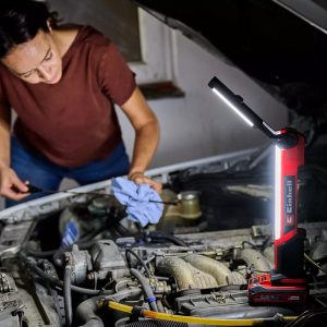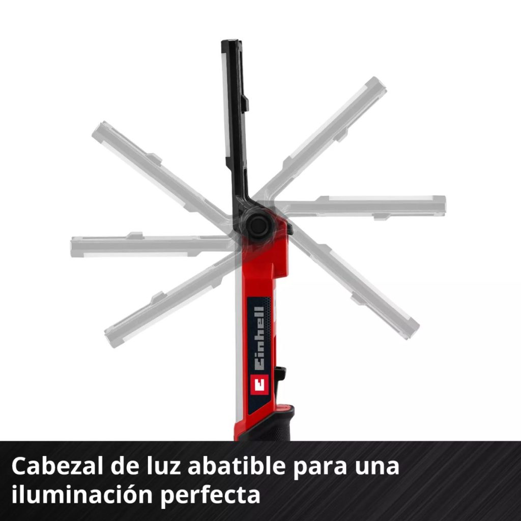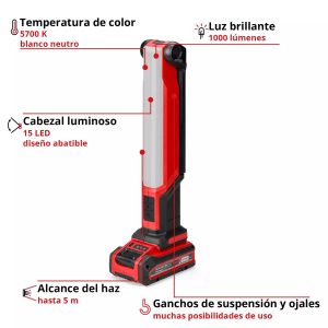 Los talleres, garajes u obras oscuros ya son cosa del pasado: La lámpara TE-CL 18/1000 S Li-Solo de Einhell alimentada por batería proporciona luz en la oscuridad. Una potente batería de iones de litio de la innovadora familia Power X-Change garantiza un nivel de luz óptimo. El cabezal de la lámpara es plegable y permite tres ajustes de luz para una gran flexibilidad de uso: los dos paneles se iluminan juntos o por separado. Su flujo luminoso de 1.000 lúmenes y los 15 LED de alta intensidad permiten iluminar a una distancia corta de hasta 5 metros. Un color de luz blanco neutro de 5700 K proporciona unas condiciones de luz más brillantes. El diseño delgado y ligero de la lámpara inalámbrica Einhell y el mango con superficie de agarre suave garantizan un uso flexible y un almacenamiento fácil y que ahorra espacio. Gracias a las numerosas posibilidades de fijación, como los ojales y el gancho de fijación, las posibilidades de aplicación son ilimitadas. La lámpara inalámbrica TE-CL 18/1000 S Li-Solo se suministra sin batería ni cargador. Éstos están disponibles por separado.