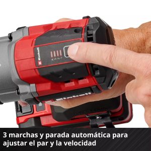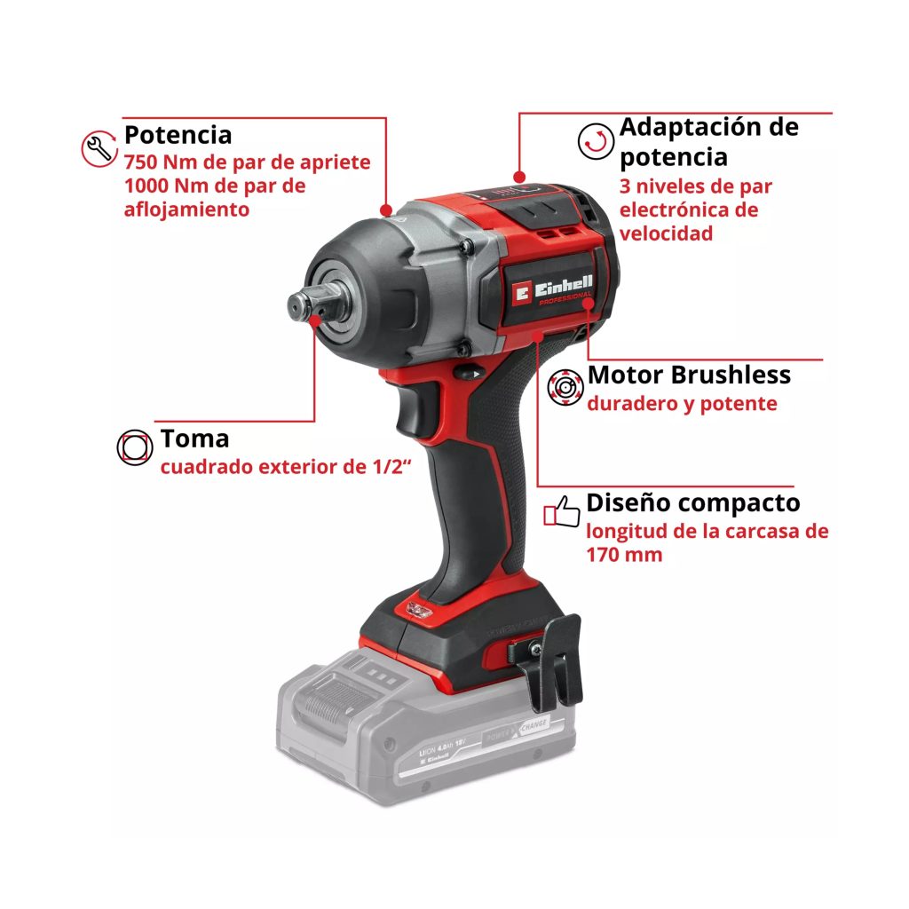 La llave dispone de un alojamiento cuadrado exterior de ½” (12,7 mm), con un par máximo de 750 Nm y un par de aflojamiento máximo de 1000 Nm. El par y la velocidad se pueden ajustar en 3 niveles, y la etapa de parada automática evita un apriete excesivo, deteniéndose a aproximadamente 100 Nm para permitir el ajuste final con llave dinamométrica. Al aflojar, el equipo se detiene automáticamente cuando no detecta resistencia.