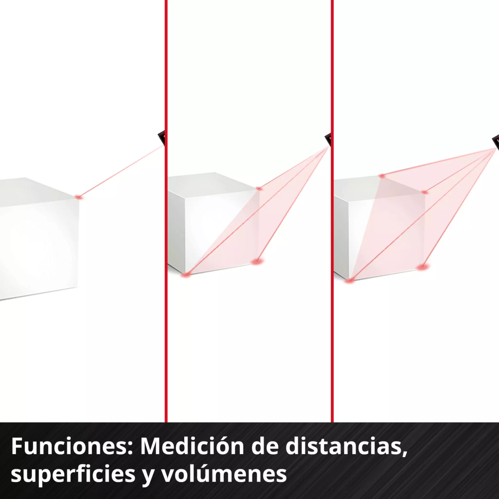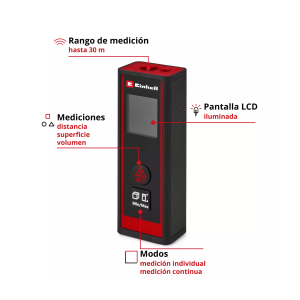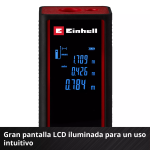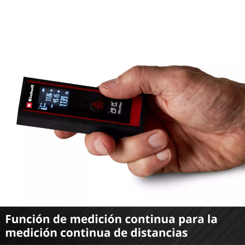 El medidor de distancia láser TC-LD 30 R Einhell es un equipo de medición preciso para aplicaciones versátiles en el hogar, jardín o en la obra. Con un rango de medición de 0,05 m a 30 m, clase de láser II (635 nm) y una precisión de +/- 3 mm / 10 m, el equipo proporciona resultados precisos en mediciones de distancia, área y volumen. Las mediciones se pueden llevar a cabo desde el lado frontal o inferior del equipo. Además de las mediciones individuales, la función de medición continua permite la determinación continua de distancias. La pantalla LCD iluminada garantiza una buena legibilidad de los resultados y un manejo intuitivo, mientras que las superficies de agarre suave proporcionan un asido seguro. El láser se puede conmutar por separado, y una desconexión automática después de un minuto protege las baterías. Para el funcionamiento se necesitan 2 pilas AAA de 1,5 V que no están contenidas.