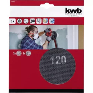 SET DE 5 LIJAS KWB COMPUESTAS POR 2 UNIDADES GR 120 Y 3 UNIDADES GR 80. DIAMETRO 180MM QUICK STICK CON ABROJO
