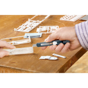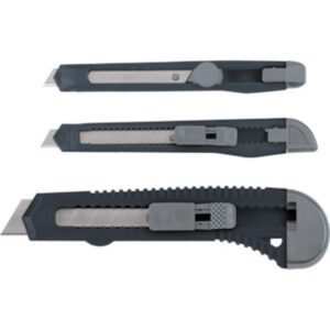Compuesto por 2 cuchillas con hoja de 9 mm y 1 cuchilla con hoja de 18 mm, fácil extracción de la hoja usada en la parte posterior a través de la tapa de cierre, una cuchilla de 9 y otra de 18 mm cada una con una corredera de hoja con función de bloqueo y una cuchilla de 9 mm con función de bloqueo del mango giratorio para un trabajo seguro, carcasa de plástico, rompedor de hojas en la tapa de cierre.