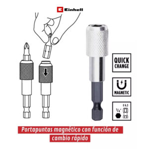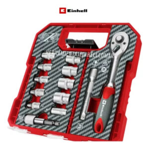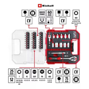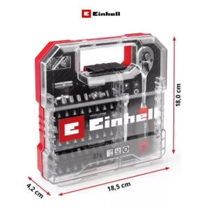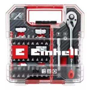 El L-Case de 37 piezas de Einhell es un completo juego de puntas y tubos compatible con todos los portabrocas y portapuntas habituales en destornilladores y taladros a batería. Incluye una serie de herramientas de alta calidad, adecuadas para una amplia gama de trabajos de atornillado y montaje. El juego Einhell contiene 23 puntas de 25 mm con mango C 6.3 y los accionamientos T10 / T15 / T20 / T25 / T27 / T30 / T40 / H2.5 / H3 / H4 / H5 / H6 / PH1 / 2x PH2 / PH3 / PZ1. / 2x PZ2 / PZ3 / SL4 / SL5.5 / SL6.5. Las puntas están fabricadas en robusto acero S2 arenado de color gris y equipadas con un anillo de color. Un portapuntas de cambio rápido 60 fabricado en acero al carbono con vástago E 6.3, manguito metálico y un potente imán garantiza un cambio de puntas rápido y sencillo. Además, el juego de puntas y tubos contiene una extensión de 75 mm para vasos de acero CV cromado mate y dos adaptadores de acero CV satinado. Un adaptador tiene una unidad hexagonal a 1/4″ y el otro una unidad hexagonal a 1/4″. Las nueve llaves de vaso con accionamiento de 1/4″ en los tamaños 4 / 5 / 6 / 7 / 8 / 13 / 11 / 12 / 10 mm están fabricadas en acero CV robusto y tienen una superficie satinada con nervaduras. Otra parte de la El juego de herramientas de Einhell es la carraca reversible, que tiene un accionamiento de 1/4″, una cabeza endurecida con 72 dientes y un par máximo de 8 kg-m. Mientras que el acero CV cromado mate proporciona una gran durabilidad, la empuñadura 2-K permite un buen agarre. El juego de puntas se guarda cómodamente en una práctica caja de almacenamiento con diseño especial de Einhell. La caja se puede cerrar de forma segura con el robusto cierre de clip de bloqueo automático, mientras que la tapa transparente permite ver el contenido de un vistazo. El juego de trinquete de 37 piezas es imprescindible con su amplia selección de herramientas de alta calidad para personal de mantenimiento y profesionales.