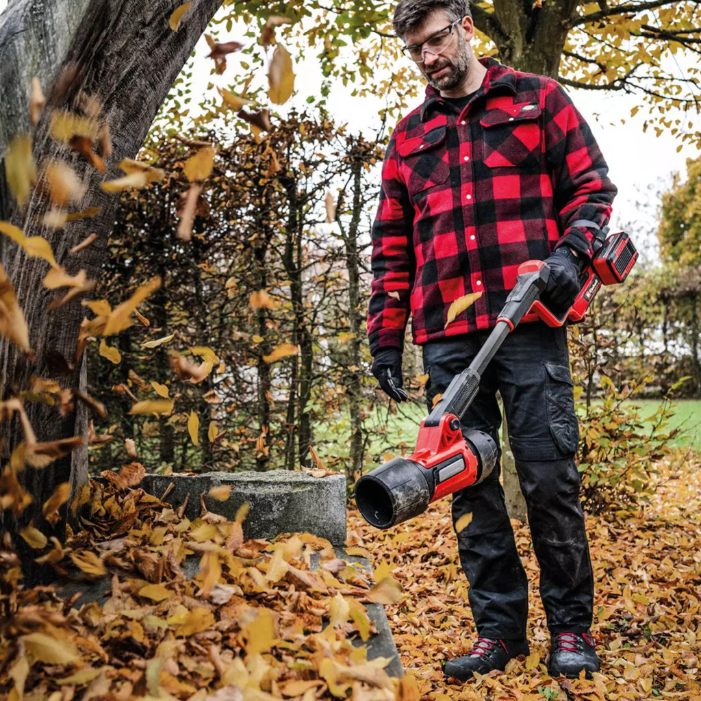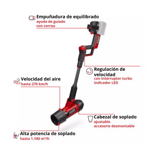 El Einhell Professional soplador de hojas con batería GP-LB 36/270 Li E BL combina una alta potencia y un diseño ergonómico para una eliminación eficiente de las hojas. Así el potente soplador de hojas con batería de 36 V trabaja completamente sin cables y es parte de la potente familia Einhell Power X-Change en la que se pueden combinar entre sí flexiblemente todas las baterías, equipos del sistema y cargadores. Con una velocidad de aire de hasta 270 km/h y una potencia de soplado de 1.100 m³/h, maneja sin esfuerzo el follaje húmedo, la suciedad e incluso las frutas y nueces pequeñas. El equipo se acciona por un Einhell motor brushless . Este motor brushless ofrece más potencia y una vida útil más prolongada que los motores de escobillas de carbono convencionales. Tras un registro online se aplican 10 años de garantía en el motor brushless. El potente ventilador axial garantiza un flujo de aire uniforme y eficiente. El modo de funcionamiento dual ofrece el máximo caudal de aire con accesorio de soplado, perfecto para superficies más grandes y follaje húmedo, o la máxima velocidad sin accesorio, ideal para trabajar con precisión bajo matas y arbustos. El cabezal de soplado se puede ajustar hasta 90° en 4 niveles, lo que facilita llegar a lugares de difícil acceso. Así, el follaje o suciedad se pueden eliminar de forma selectiva desde abajo. El interruptor turbo, en combinación con la regulación de velocidad continua, permite una potencia de soplado de hasta 1.100 m³/h. Los prácticos LED muestran la velocidad actual establecida. La empuñadura de equilibrado con agarre suave y un práctico reposabrazos garantiza un manejo agradable, mientras que la correa del antebrazo proporciona un sostén y guiado adicionales. Esto hace que incluso los usos más prolongados sean cómodos y sin fatiga.