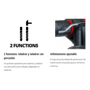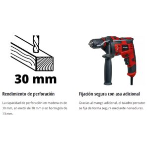 El taladro percutor TC-ID 720/1 E es una potente herramienta con dos funciones: Perforación y taladrado de percusión para trabajar correctamente en función del material. La máquina es lo suficientemente potente como para realizar perforaciones en cualquier material. El sistema de velocidad electrónico garantiza un trabajo adecuado según el material y la aplicación, así como las funciones seleccionables de perforación y perforación por percusión, con las cuales el usuario se podrá adaptar a la perfección al trabajo correspondiente. La rotación hacia la derecha y la izquierda es ideal para taladrar y atornillar en materiales duros. El bloqueo de funcionamiento continuo permite trabajar de forma cómoda y sencilla. Las amplias y ergonómicas superficies Softgrip hacen que el trabajo resulte agradable. El taladro percutor se puede sujetar con seguridad gracias a las nervaduras de su empuñadura adicional. El robusto portabrocas de liberación rápida de 13 milímetros contiene los accesorios deseados (portabrocas de 1,5 a 13 milímetros). Además, el taladro percutor TC-ID 720/1 E también es adecuado para la fijación en un soporte de perforación con cuello de sujeción de 43 mm. El tope de profundidad de perforación, hecho de metal sólido, se puede ajustar sin límite. La capacidad de perforación es de 30 milímetros en madera, 10 milímetros en metal y 13 milímetros en hormigón.