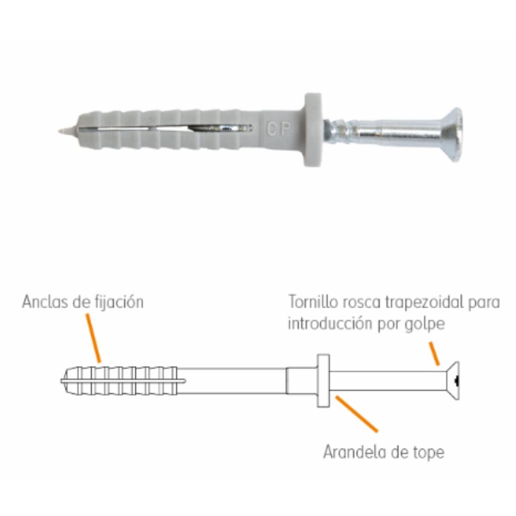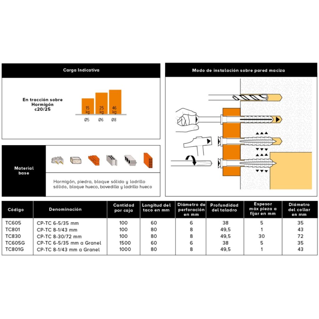 El TC es un tarugo de nylon de expansión por golpe para fijaciones ligeras en materiales macizos. Es un taco ideal para el montaje a través y se suministra con el tornillo premontado, lo que provoca una notable disminución en el tiempo de colocación. El tornillo tiene rosca tipo diente de sierra lo que favorece la penetración a golpes y ofrece sencillez para el desatornillado.